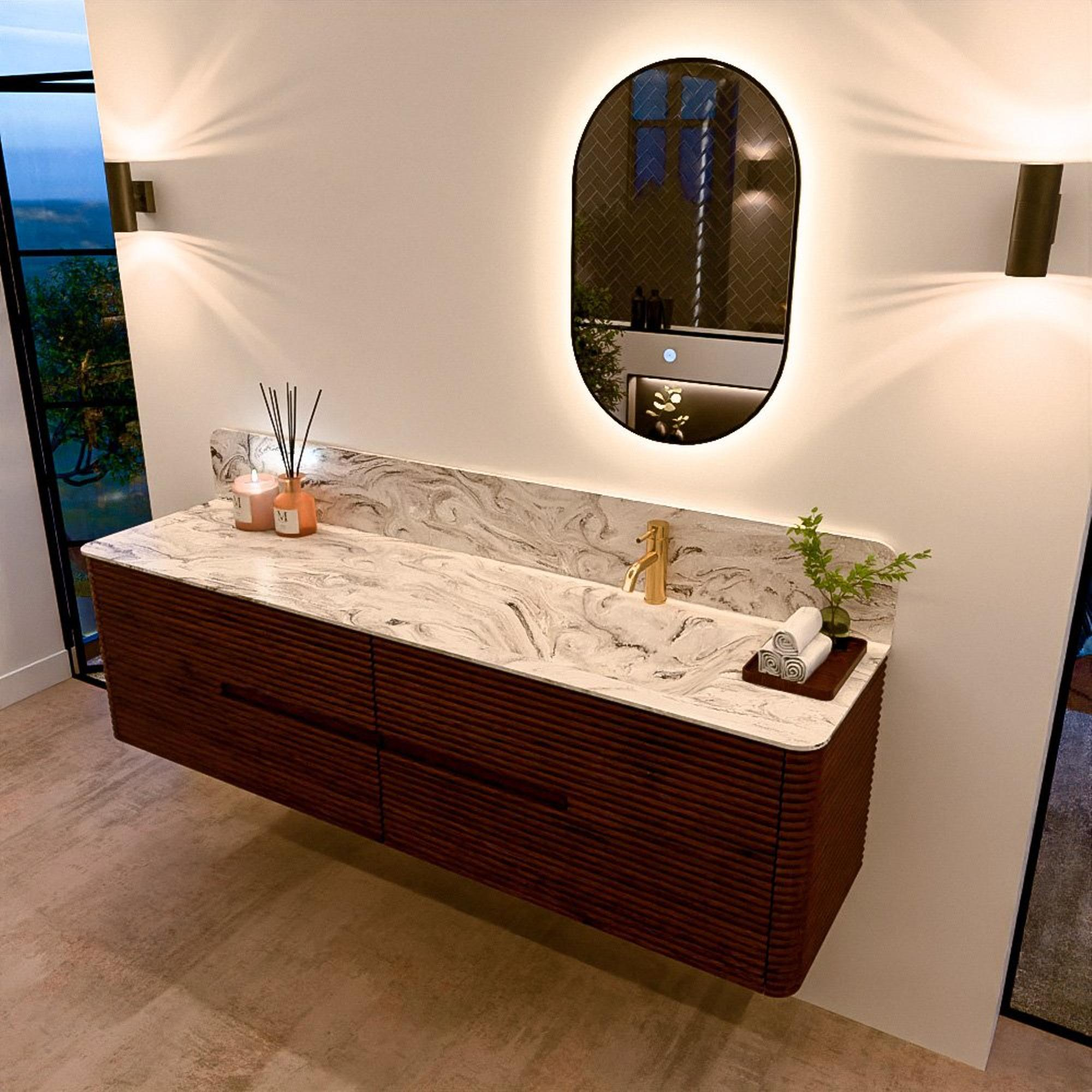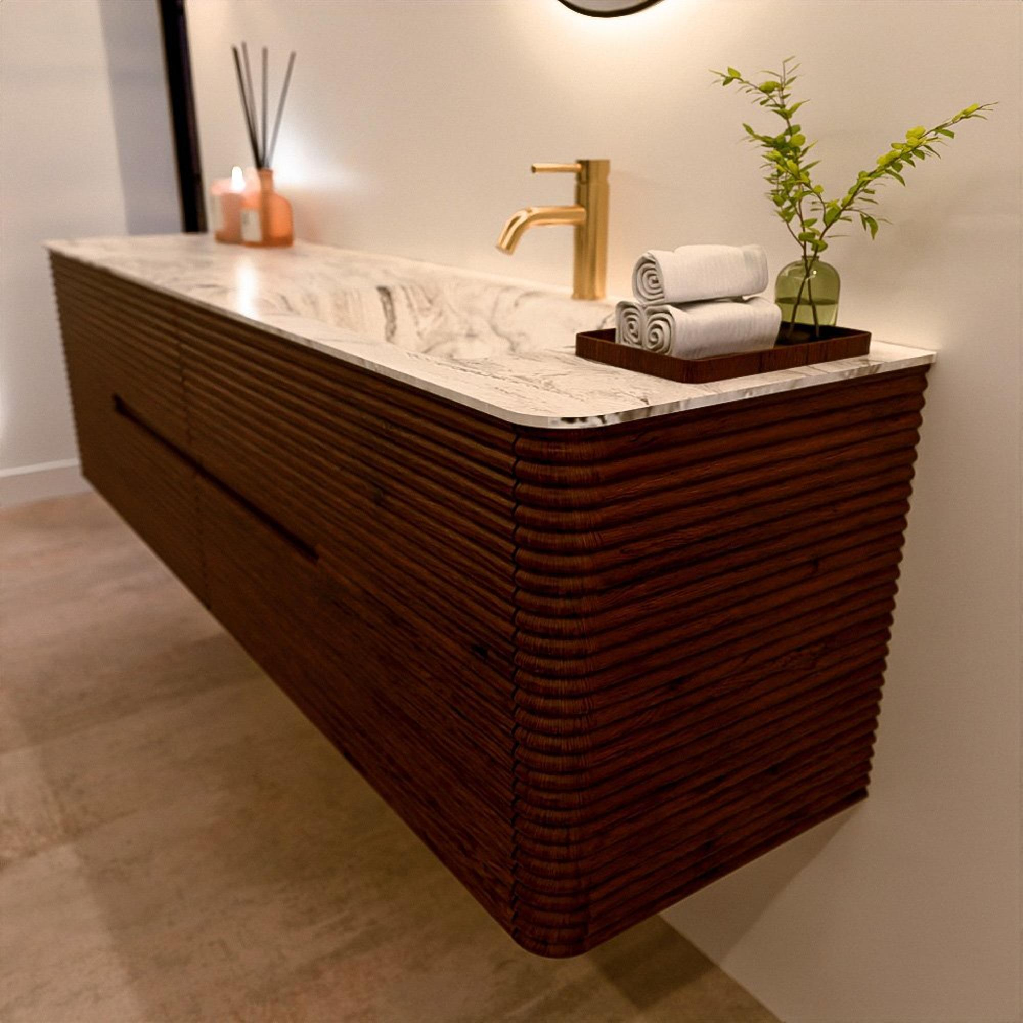Het CIRO-DLUX badkamermeubel is ontwikkeld voor wie kiest voor modern design, natuurlijke materialen en hoogwaardige functionaliteit. Met maatvoeringen van 70 cm tot 190 cm past de CIRO-serie moeiteloos in zowel compacte badkamers als royale designruimtes. Elk meubel is een uitgebalanceerde combinatie van esthetiek, ambacht en duurzame kwaliteit.
