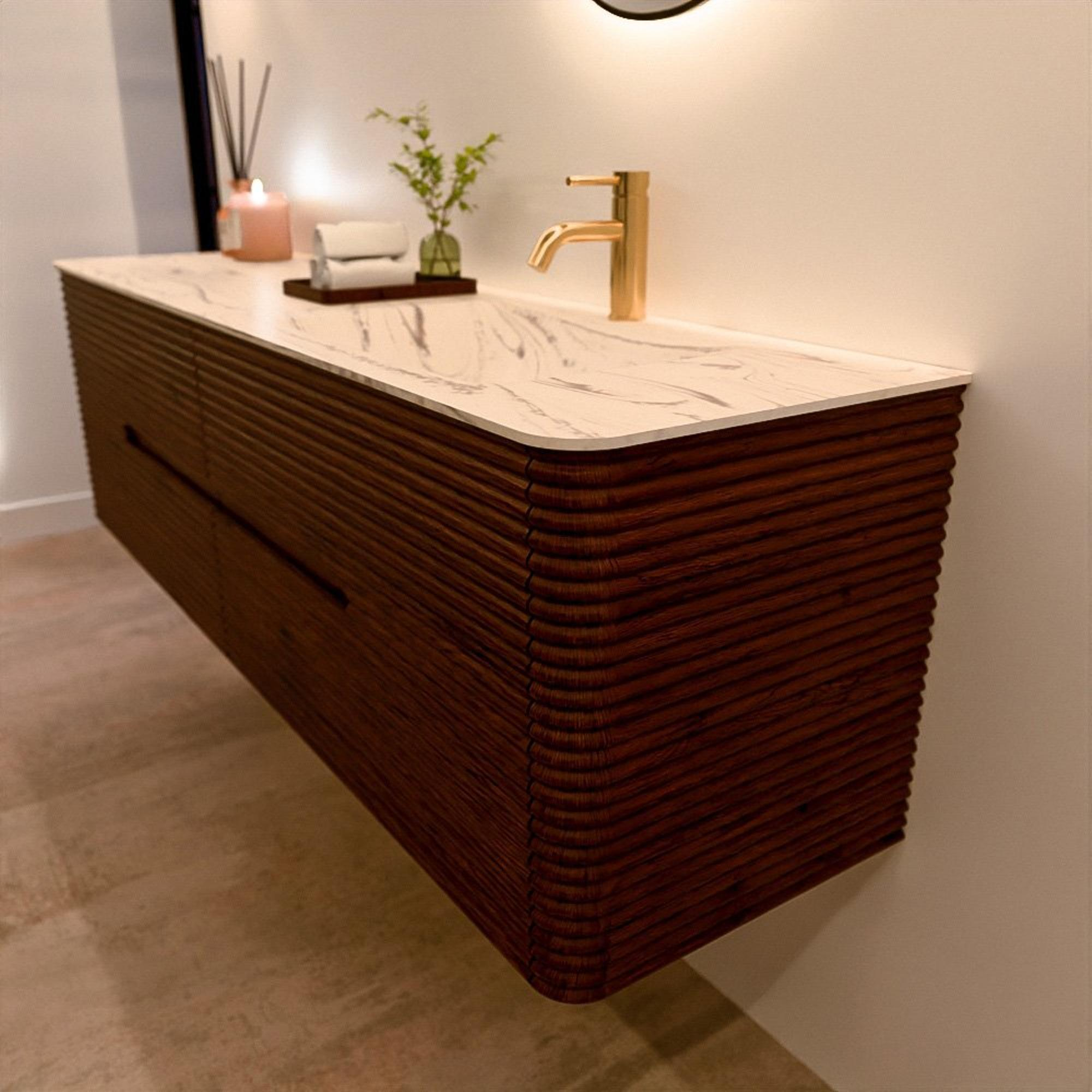 Het CIRO-DLUX badkamermeubel is ontwikkeld voor wie kiest voor modern design, natuurlijke materialen en hoogwaardige functionaliteit. Met maatvoeringen van 70 cm tot 190 cm past de CIRO-serie moeiteloos in zowel compacte badkamers als royale designruimtes. Elk meubel is een uitgebalanceerde combinatie van esthetiek, ambacht en duurzame kwaliteit.