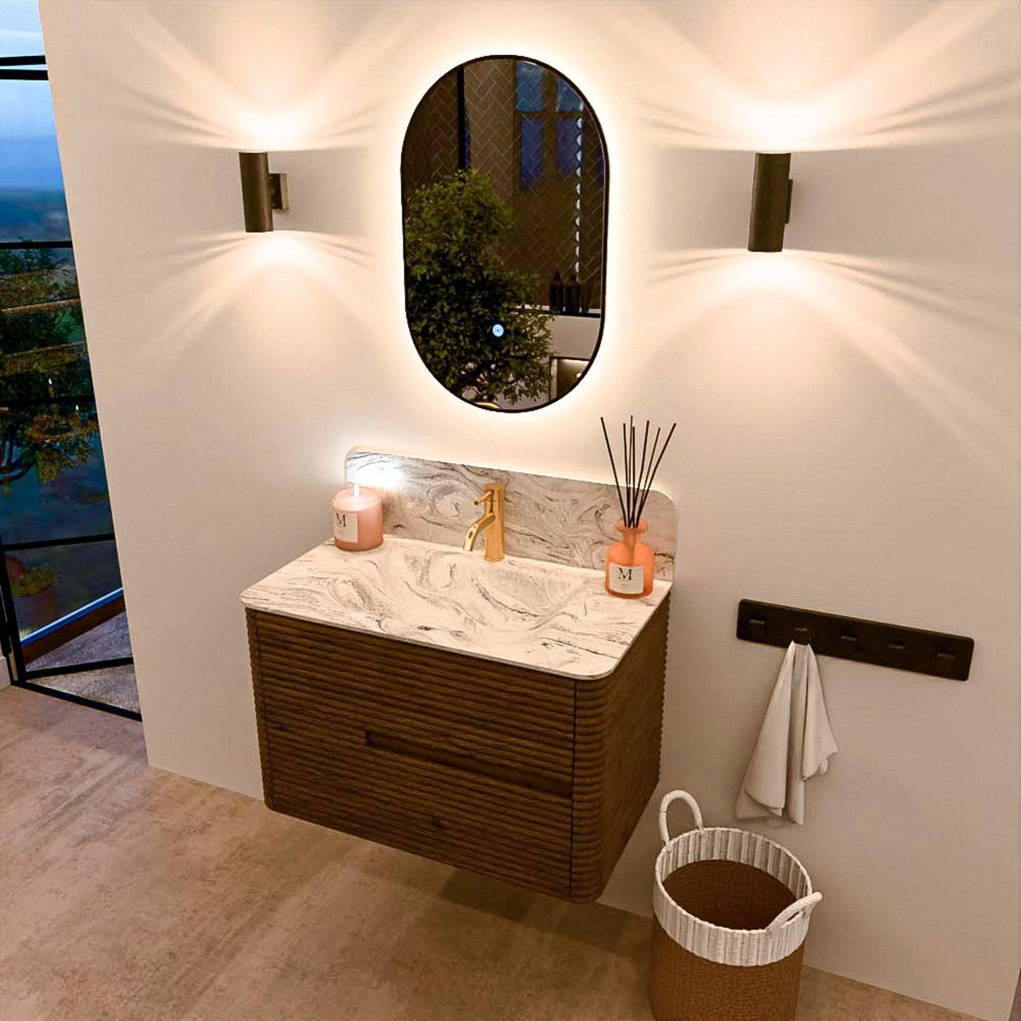 De wastafels van de CIRO-lijn worden vervaardigd uit hoogwaardig Solid Surface, een materiaal dat bekendstaat om zijn strakke uitstraling, hygiënische eigenschappen en uitstekende duurzaamheid. De wastafels zijn beschikbaar in 11 marmer- en travertin tinten, waarmee je het luxueuze karakter van natuursteen combineert met de voordelen van Solid Surface. De organische vorm van de kom versterkt het serene, sculpturale karakter van het ontwerp.